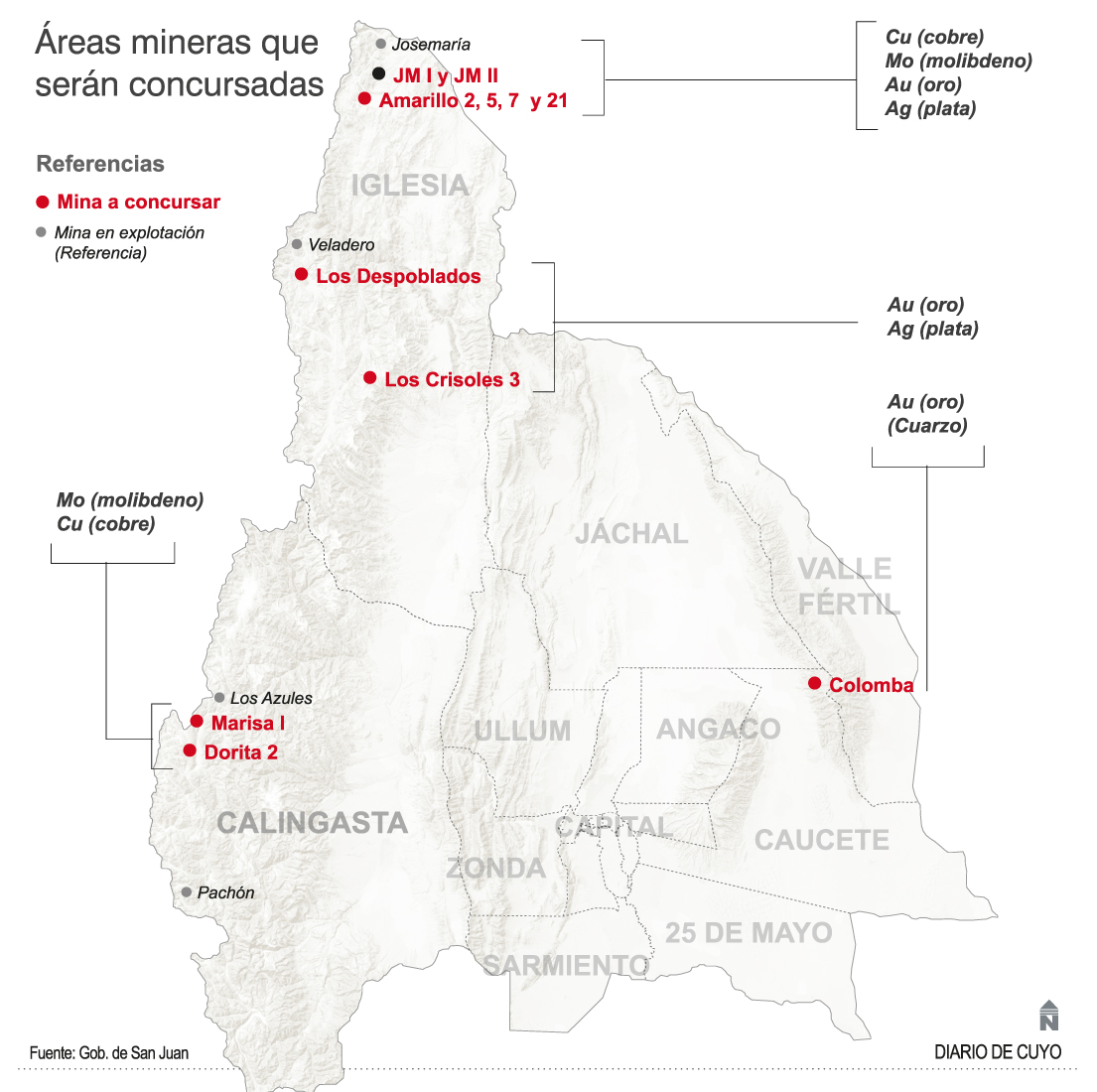 Se trata de las áreas denominadas JM I y II, Amarillo 2,5,7 y 21, Los Despoblados y Los Crisoles 3, en Iglesia, Marisa I y Dorita 2 en Calingasta y Colomba en Caucete (ver infografía).