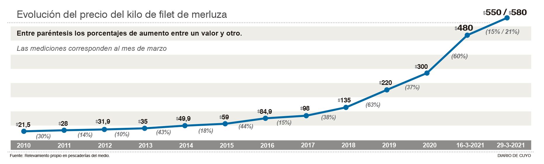 Llegó la Semana Santa y el precio del pescado no deja de escalar. Hace sólo dos semanas el kilo de filet de merluza fresco se vendía entre $450 y $480 el kilo en las pescaderías de la provincia, y ahora los sanjuaninos se encontraron con que el kilo cuesta entre $550 y $580 en los diferentes locales. En 15 días aumentó un 22% y lo peor para el bolsillo del consumidor es que hoy, o mañana, se espera otro aumento: en la mayoría de los negocios dicen que los proveedores con el cargamento proveniente de la Costa Atlántica, para entregar la carga para el Jueves y Viernes Santo en la provincia, traerá variaciones de 5% al 9%, con lo cual el producto llegará a los $600. Es decir, el doble de los $300 que costaba el kilo en la Semana Santa de 2020. En la pescadería El Vasco aseguraron que alcanzará ese número, o quizá lo supere, a los $620. En los locales dicen que el precio se forma en la costa bonaerense y que los barcos están teniendo poca pesca por estos días, por eso sube. También influye el flete hasta San Juan. ""Ha habido una suba importante en las últimas dos semanas del filet de merluza despinado y entre hoy y mañana estará entre los 550 y los 600 pesos", dijo también German Aguilar, desde la pescadería Aguilar en Pocito. ""Nosotros lo hemos estado vendiendo en 550 la semana pasada y supongo que ahora viene otro ajuste, pero menor", dijo. Agregó que en la última semana hubo bastante movimiento y esperan que se repita estos días, pero admitió que por la situación económica en el local han restringido un poco los pedidos. En Pescadería Gallerano hasta ayer vendían el kilo a $500 pero hoy esperan que llegue más filet de merluza y estiman que subirá a $550 o $580. ""Nos han dicho que hay poca pesca, siempre pasa lo mismo para esta época", contó Guillermo. En la pescadería Todo Fresco el kilo está a $540 y no saben a cuánto vendrá esta semana, aunque indicaron que lo único que va a aumentar es el filet de merluza porque sube la demanda en todo el país y aumenta el precio. ""La venta no está como otros años, porque está muy malo, pero en los últimos días ha repuntado", indicaron en ese local.