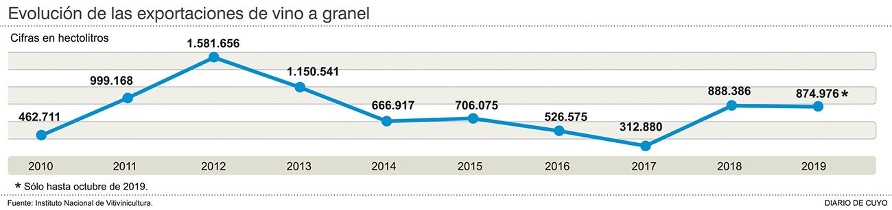 Entre enero y octubre de este año se vendieron 87,4 millones de litros de vino a granel al exterior, lo que implica un crecimiento de casi el 18% respecto al 2018, según informó el Instituto Nacional de Vitivinicultura (INV). Con este volumen de venta el sector se encamina a cerrar otro año tan bueno como el 2018 cuando comenzó a levantar cabeza impulsado por la mejora del tipo de cambio: los expertos dicen que el precio del litro de vino argentino a granel está barato frente al de otros competidores y por eso es tan buscado. Se advierte mejor al mirar las cifras del año pasado, cuando se exportaron 88,8 millones de litros, casi el triple del 2017 cuando el volumen de los embarques fue de 31,2 millones (un aumento del 184%, ver infografía). Desde el INV destacaron que los volúmenes de exportación más altos de la década son los de los años 2012 y 2013, cuando se vendió por encima de los 100 millones de litros, empujados por buenos precios y alto nivel de consumo. Luego, entre 2014 y 2015 ,con un dólar menos competitivo, se mantuvo la exportación alrededor de los 70 millones de litros.