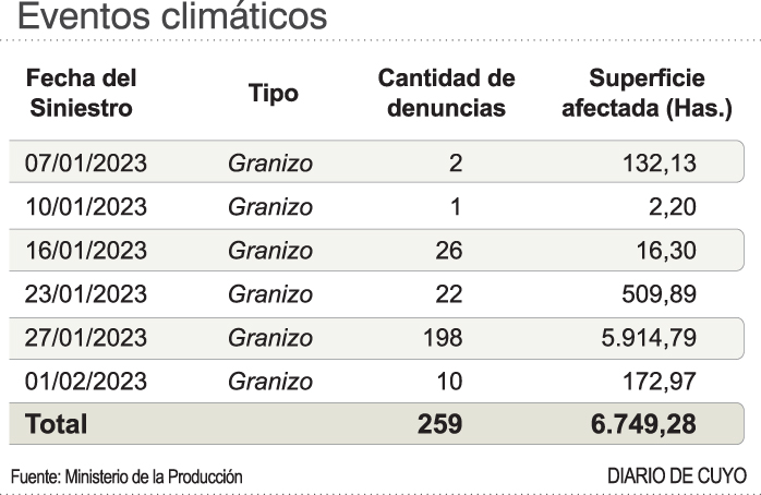 1.266 Es la cantidad de hectáreas de parrales denunciados con pérdidas por granizo el 27 de enero. Un relevamiento determinará el daño total.