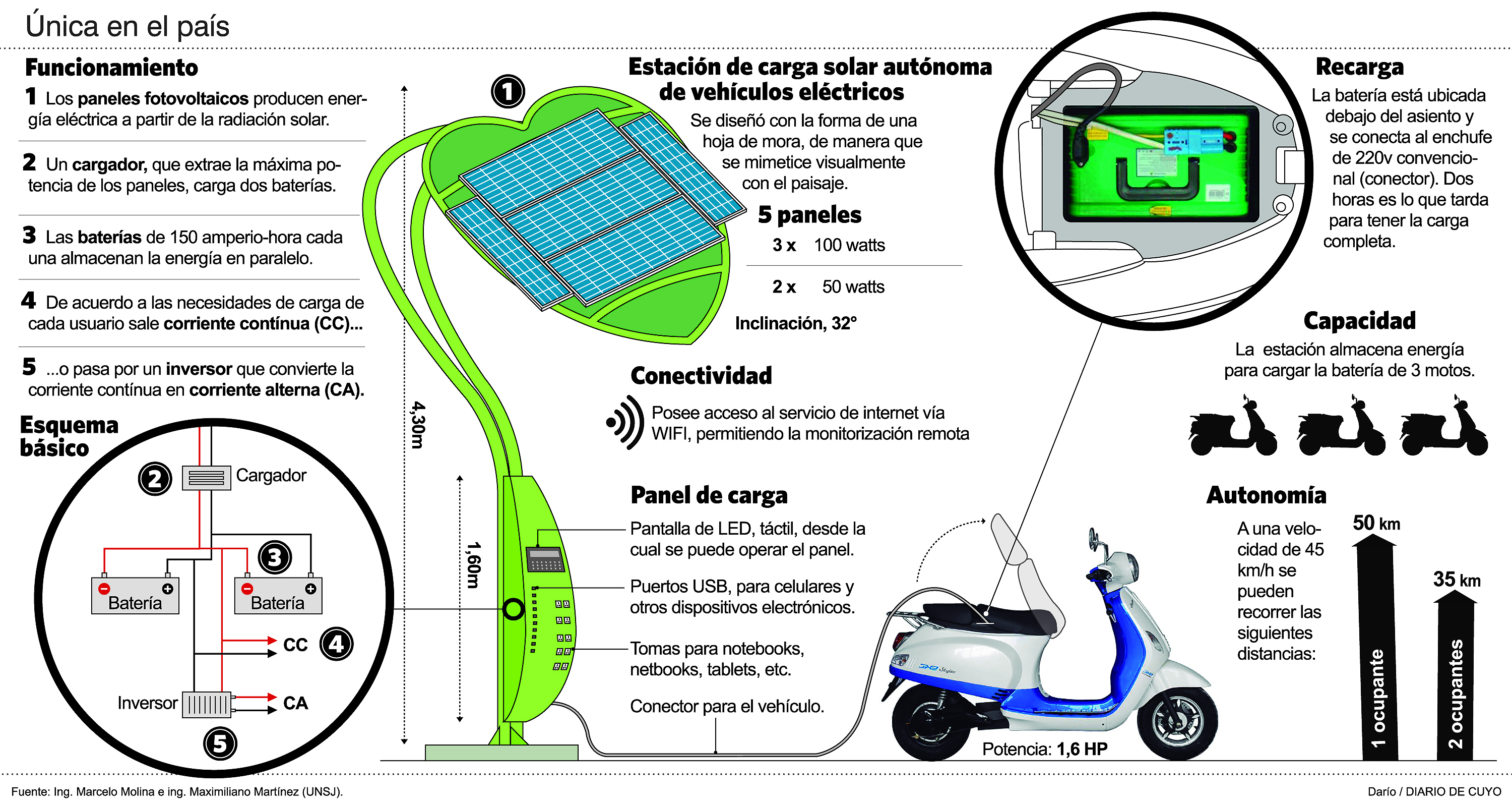 En una primera etapa podrá ser utilizada para cargar el celular, una notebook o la primera moto impulsada con esta tecnología que hay en la provincia. Pero en el futuro servirá para abastecer a cualquier vehículo eléctrico que llegue a San Juan. Se trata de la estación solar autónoma, la primera en su tipo en Argentina, que estará ubicada sobre la avenida Libertador San Martín, a metros de Urquiza y que será de libre acceso, de 7 a 21. En el proyecto trabajan los técnicos del Instituto de Energía Eléctrica de la UNSJ, que la quieren tener lista y funcionando para noviembre. El presupuesto total de los trabajos está calculado en los $70 mil.