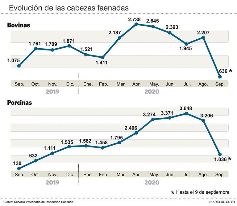 En el caso de ganado porcino, la escalada es meteórica: de una faena de solo 130 animales en septiembre de 2019 en el mes de agosto pasado se pasó a 3.206 animales, lo que significa un aumento de 2.366%.
