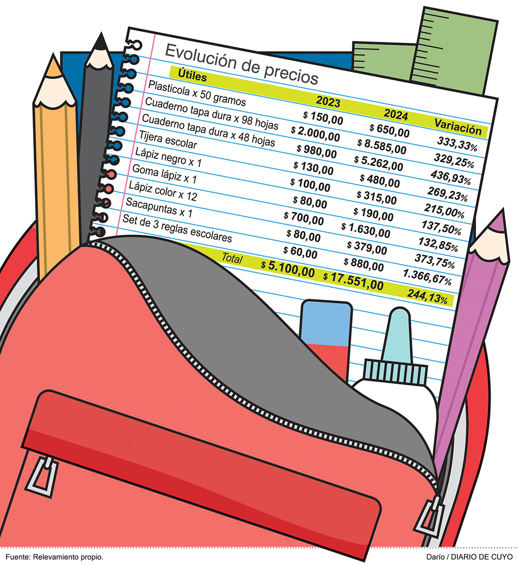A 16 días del inicio de clases, enviar a un hijo a estudiar puede ser para los padres un desafío económico bastante alto que afrontar debido a los altos índices de inflación que desde hace dos meses no descienden de los 20 puntos. En ese marco, equipar a un niño (vestimenta, calzado, útiles, guardapolvo) para arrancar su primer año de primaria en escuela pública está en 267 mil pesos, en base a un relevamiento realizado por DIARIO DE CUYO. Dentro de esa cifra, el precio de la canasta escolar (útiles) escaló en tan sólo un año un 244,13 por ciento. En el caso de un chico que asiste a una escuela privada, el monto total se va 276 mil pesos, por el valor de la chaqueta.