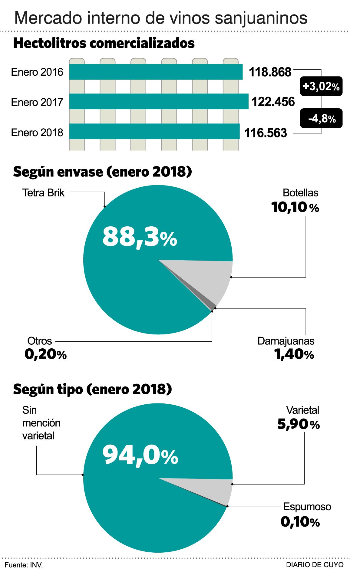 El descenso es fuerte teniendo en cuenta dos factores: uno, que se viene de un año -el 2017- donde había aumentado un 3% la comercialización frente al año anterior (ver infografia). Y dos, que la comercialización en todo el país en enero subió un 1,3% respecto al 2017, traccionada por provincias con menos historia vitivinícola que San Juan (ver aparte). En vinerías y distribuidoras locales consultadas admiten que la baja se nota efectivamente en la facturación, y lo atribuyen -tal como se viene comentando desde hace un tiempo a nivel nacional-, a que la cerveza viene creciendo en popularidad y ventas, y al aumento de precios que han tenido los vinos, que van del 30 al 40 % en los últimos 12 meses. En los negocios dicen que lo que mantiene la venta de vino son los envases que rondan los 100 pesos, y que en cambio ha bajado notoriamente la salida de los buenos varietales de guarda que trepan a los 200, 300, y más pesos. Las estadísticas oficiales corroboran ese dato: según el INV, el 94% de los litros despachados a mercado interno correspondió a vinos sin mención varietal -aquellos que en la etiqueta sólo indican que se trata de un “tinto” o un “blanco”, un segmento que muestra una merma del 3,7%. El 5,9% fue vino varietal, con una baja del 20,9% en las ventas. El mínimo porcentaje restante es de los espumosos. En cuanto a la presentación, el 88,3% de las ventas se realizó en envases multilaminados, es decir, el clásico tetrabrick. Le siguen en importancia las botellas con el 10,1% y las damajuanas con el 1,4%.