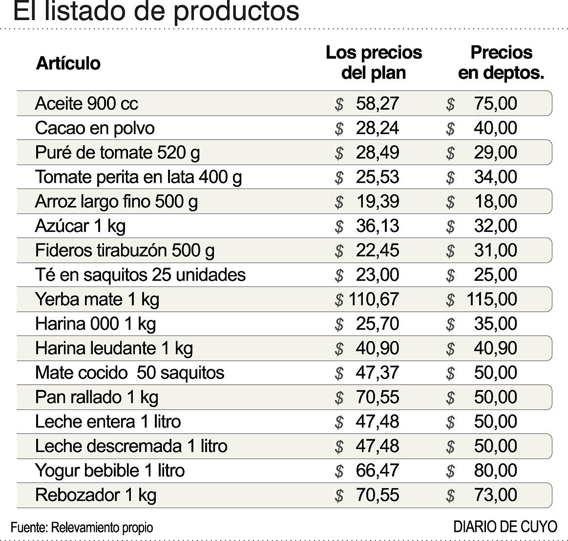 Entre los productos que se encuentran con valores por encima del plan oficial pueden citarse los ejemplos del aceite (30%), cacao, (40%), tomate perita (30%), harina (36%), yogur (20%) y rebozador (3,5%). A su vez, en el relevamiento también se encontraron artículos al mismo valor, como en el caso de la harina leudante, y hasta otros más baratos, como el arroz o el kilo de azúcar (ver infografía).