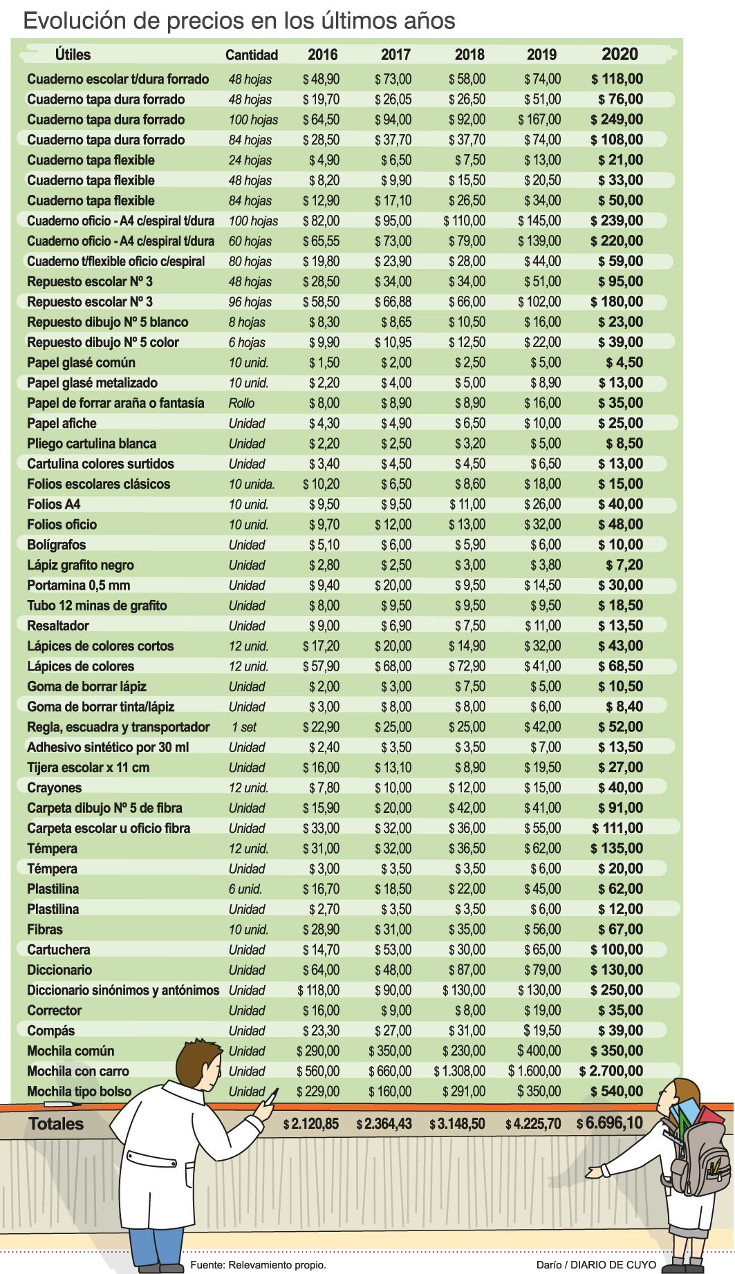 La canasta escolar con 51 útiles que DIARIO DE CUYO viene relevando desde hace años en el mes de febrero, este 2020 exigirá un esfuerzo alto al bolsillo: no hay uniformidad en los aumentos de los productos que muestran una muy variada dispersión; pero se puede anticipar que aquellos útiles escolares más usados, como los cuadernos y las mochilas, vienen con incrementos de hasta el 69%.