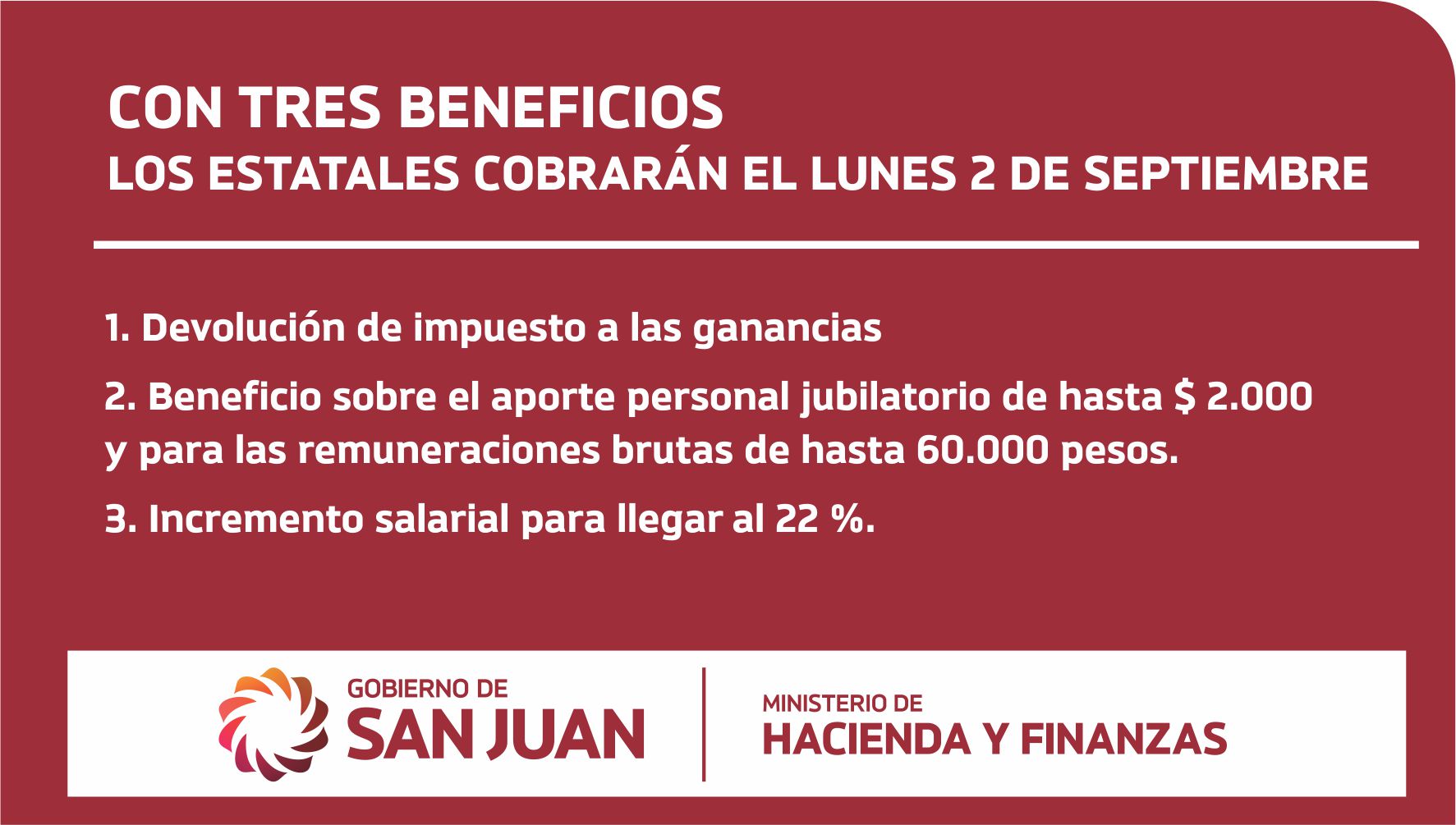 Los empleados estatales de San Juan cobrarán su haberes el próximo lunes 2 de septiembre y con tres beneficios en sus recibos, según informaron las autoridades.