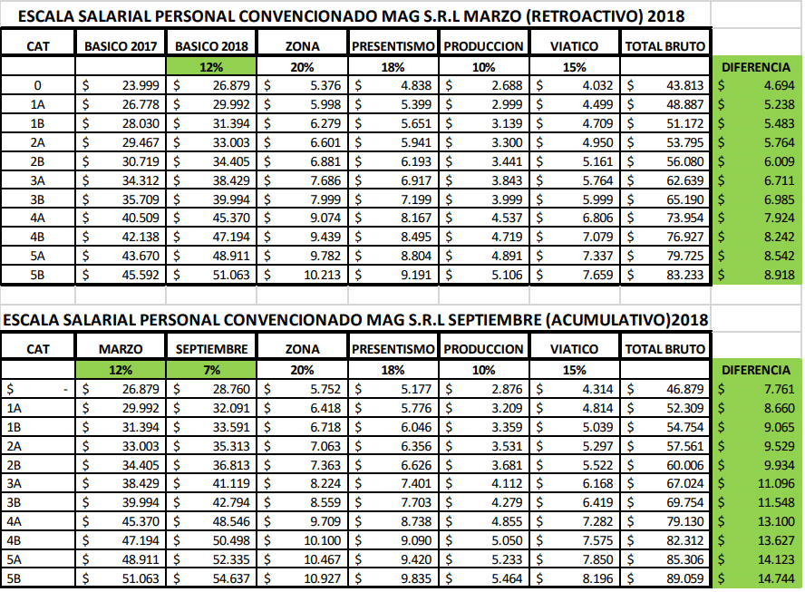 De esta manera cuando se complete el aumento en septiembre, la categoría más baja (0) pasará de 23.999 pesos a 28.720 pesos de básico (a esto hay que sumarle zona, producción, viáticos y presentismo) y la más alta (5B) pasará de 45.592 pesos a 54.637 pesos.