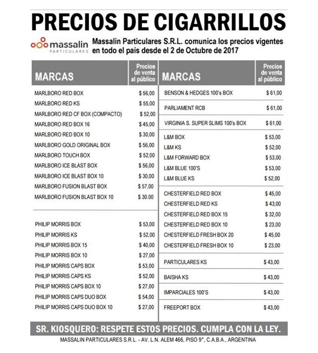 Massalin Particulares anunció que desde el 2 de octubre se actualizará los precios de sus cigarrillos, con un aumento promedio de 4%, lo que significa que subirán los importes entre 1 y 2 pesos.