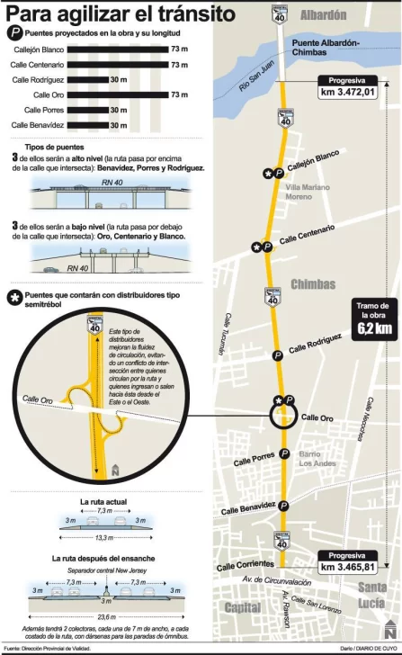 Se trata de una autopista doble vía y doble carril con un separador central de 6.500 metros en la primera sección comprendida entre el lateral de avenida de Circunvalación y el puente sobre el río San Juan. En ese tramo se construirán seis puentes dobles sobre las arterias que atraviesan la ruta 40, avenida Benavídes y calles Oro, Porres, Rodríguez, Centenario y callejón Rosales, en el ingreso a la villa Mariana Moreno. El proyecto incluye la ejecución de las colectoras laterales, la iluminación y el soterramiento del tendido de alta tensión de 132 KV para reducir el impacto visual que existe actualmente en el acceso Norte.