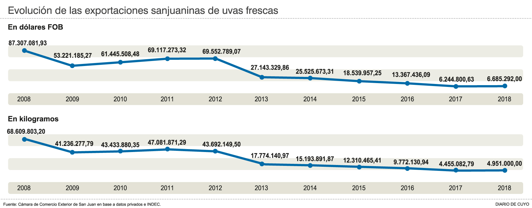 Cuando todavía no están los números finales, la temporada de exportación de uva en fresco, un negocio en el que San Juan es líder en el país, cerrará con un volumen estimado en los 4 millones de kilos, el más bajo de los últimos 12 años, según fuentes de la actividad, y un 18% inferior a la temporada pasada, que cerró con la salida de 4,9 millones de kilos. En esta situación tiene que ver la falta de competitividad, causada por los elevados costos internos, fletes y energía caros, servicios de exportación elevados, a lo que se suma la fuerte presión impositiva. Incluso mencionan que si bien el tipo de cambio es más elevado, con un dólar que supera los 40 pesos, los productores sufren por la aplicación de retenciones y quita de reintegros.