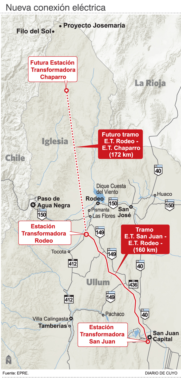 La línea que va desde la ET Nueva San Juan, ubicada en Rivadavia, hasta la ET Rodeo es operada actualmente en 132 kV, según explicó Trad, pero para llevar energía a los grandes proyectos mineros hará falta energizarla en 500 kV. Esa línea ya está construida y tiene 161 kilómetros de extensión (ver infografía). Pero hará falta construir una nueva línea hasta la futura ET Chaparro, que estará ubicada en las inmediaciones de la llamada Aguada del Toro. Esa línea también operará en 500kV.