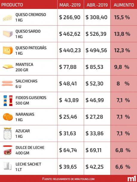 En tanto, si el ocular reposa en los últimos 12 meses, los fideos se dispararon un 105%, el queso pategrás un 100,9%, el cremoso aumentó un 88,6%, el sardo un 83,7%, la manteca subió un 79,2%, la leche un 77,2% y las salchichas un 7%. En tanto, la naranja bajó un 18% en abril respecto al valor que se vendía en abril de 2018.