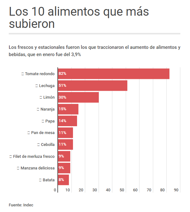 “La suba de Alimentos y bebidas no alcohólicas (4,9%) fue la de mayor incidencia en todas las regiones. Lo más relevante en la división fue el incremento de Verduras, tubérculos y legumbres, donde se destacaron el tomate, la lechuga, la papa y la cebolla, entre otras. También sobresalió dentro de la división el alza de Frutas, especialmente el limón y la naranja”, detalló el Instituto Nacional de Estadística y Censos en su informe de inflación de enero.
