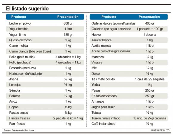 Se detallan en la lista 38 productos de 20 rubros indispensables para la alimentación, cuyos precios se intentarán congelar por un lapso de 60 días o más. Allí se encuentran varios lácteos, carnes, pastas y granos, como productos de panificación, aceites, café y azúcar, entre otros (ver infografía), con las cantidades sugeridas. No incluye productos perecederos como hortalizas y frutas.