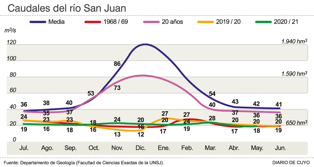 Pero, además, señala que el régimen hídrico que alimenta al río San Juan, que abastece los diques, es nivo-glacial. Pero el problema es que los caudales del río (ver infografía) vienen en baja. Y es porque el valor medio histórico registrado es de 1.940 hm3, pero en los últimos dos ciclos hídricos es de aproximadamente 600 hm3. Y su proyección para el actual ciclo y el venidero (2021/2022) es sensiblemente menor de 580 hm3.