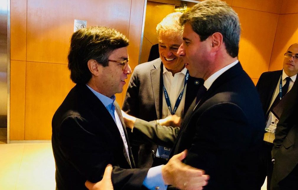 El gobernador Uñac, ayer junto al presidente del BID, Luis Alberto Moreno, en la asamblea anual de la entidad realizada en Mendoza.