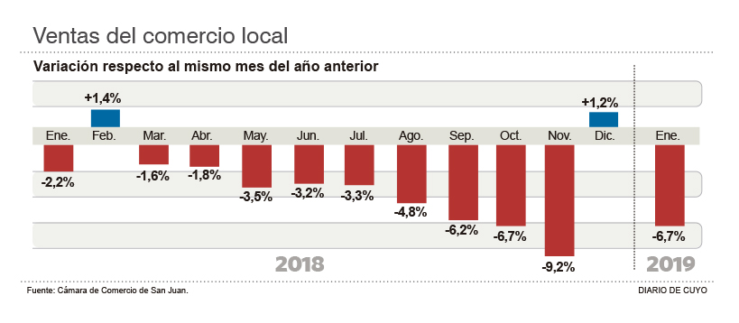 Los negocios sanjuaninos no lograron mantener el repunte logrado con la venta de fin de año y Reyes y en enero la comercialización en unidades vendidas cayó 6,7% respecto a igual mes del 2018, según informó ayer la Cámara de Comercio de San Juan. Para desacelerar esa caída y tener al menos un equilibrio de caja en los primeros meses del año ahora apuestan al megaoutlet en los departamentos de Capital, Chimbas, Caucete, Pocito, Santa Lucía, Rivadavia y Rawson que tendrá lugar durante todo febrero. Con descuentos de hasta el 70% en ropa, indumentaria y accesorios, el cada vez más popular 2×1, pero fundamentalmente con ofertas en útiles escolares; los comerciantes tiene expectativas de mejorar o al menos mantener la actividad que está complicada por la caída general del consumo. El presidente de la Cámara de Comercio, Hermes Rodríguez, dijo que el declive del mes pasado en las ventas minoristas se notó con mayor fuerza en los locales dedicados a los rubros de Indumentaria, Calzado y consumo de Alimentos que mostraron una retracción en las unidades vendidas. En cambio, se observó una leve recuperación en el rubro Electrodomésticos y buenas ventas en juguetes en líneas generales y rodados de plástico. En ese sentido, la venta de Reyes tuvo una leve recuperación del 0,5% respecto a igual celebración del año anterior en la provincia, y fue mejor que a nivel nacional donde las ventas cayeron un 11%. Aquí, con un gasto promedio de $420, los más vendidos fueron los juguetes de fabricación nacional, que alcanzaron el 80% de las salidas. En cuanto a la modalidad de ventas, en enero se observó una mayor utilización de las tarjetas de crédito y, nuevamente como en el último trimestre, el crédito de la casa se impuso como una opción que se está repitiendo y replicando en los diferentes departamentos de la provincia, explicaron desde la Cámara. La caída registrada en enero es preocupante teniendo en cuenta que se la está comparando con las ventas del igual mes del 2018, las que a su vez también habían caído un 2,2% (ver infografía).