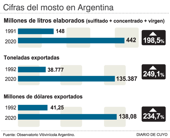 Cuando se fundó la CAFEM, en 1991, en Argentina se producían por año 148 millones de litros de mosto (sumando el total de Sulfitado, Concentrado y Virgen). Al 2020 (último año completo relevado), el país elaboró 442 millones de litros. Esto es un crecimiento acumulado del 198,5%, según datos aportados por el Observatorio Vitivinícola Argentino.