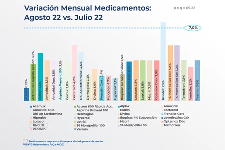 Al medir los precios de los medicamentos, se detectó que aquellos que habitualmente son usados para internaciones tuvieron las mayores subas, llegando al 32% en promedio durante el cuatrimestre mayo-agosto de este año, sensiblemente por encima del aumento del Índice de Precios al Consumidor medido por el INDEC, que en el mismo período fue del 24,8%.