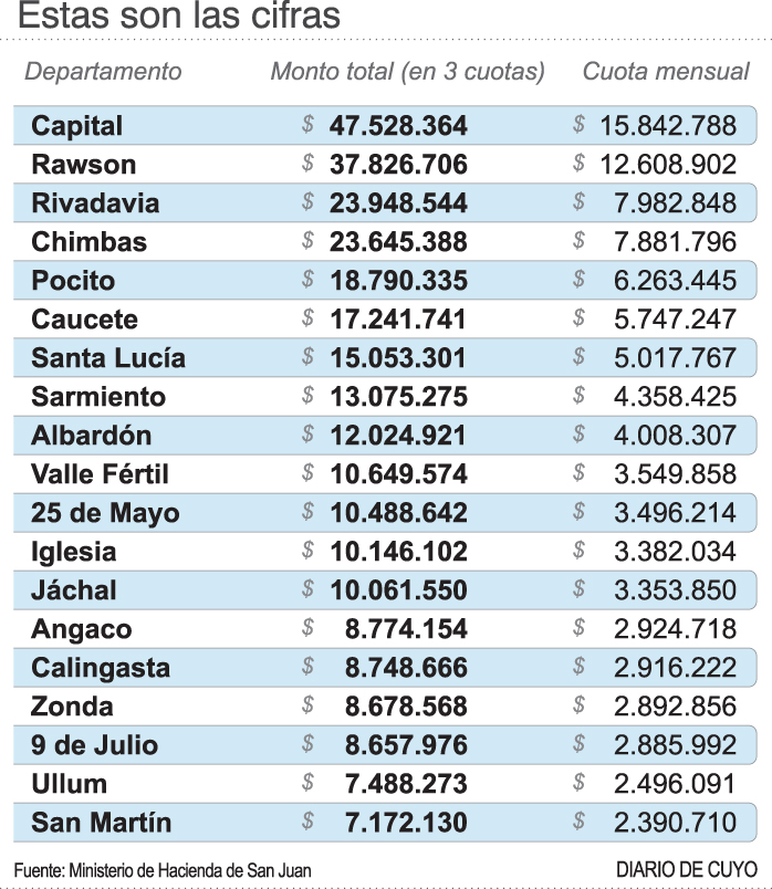 López insistió en que, a partir de la ley de coparticipación municipal que sancionó la gestión uñaquista, "cada intendente administra su presupuesto. No están obligados a tener la misma paritaria que la provincia. Sus decisiones, en cuanto a los acuerdos salariales, las hacen en función de su recaudación". No obstante, aclaró que, "entendiendo la situación global", Uñac tomó la decisión política de auxiliar a los municipios. En ese marco, la ministra explicó que las tres cuotas de 100 millones de pesos cada una se distribuirán "el 50 por ciento en función de su planta de personal (permanente) y el 50 restante en función de (sus índices de) la coparticipación municipal" (ver infografía). Además, la primera tanda estará acreditada esta semana. El aporte, indicó, saldrá del Fondo de Emergencia Municipal (FEM), el cual está destinado a cubrir desfasajes financieros o situaciones de emergencia por cuestiones, por ejemplo, climáticas.