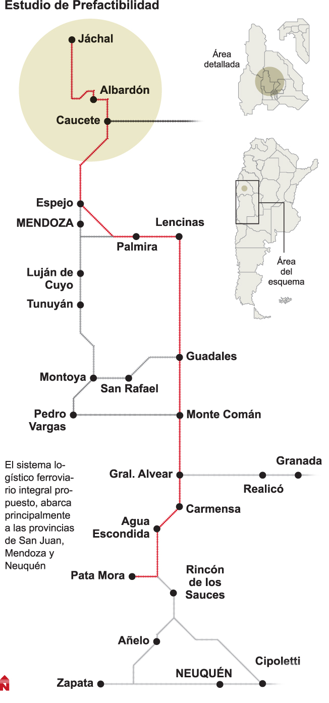 La línea que impulsa ahora el gobierno de San Juan empieza en Jáchal y llegaría a la localidad Neuquina de Añelo, que es uno de los puntos más cercanos a los yacimientos petrolíferos de Vaca Muerta. Uno de los tramos que demandará más trabajo es la conexión entre el Norte y Caucete. Este tramo, según el informe, se encuentra "abandonado, depredado, faltan puentes y numerosos tramos de vía". Para este sector la recomendación era reconstruirlo y además hacerlo con un formato distinto.