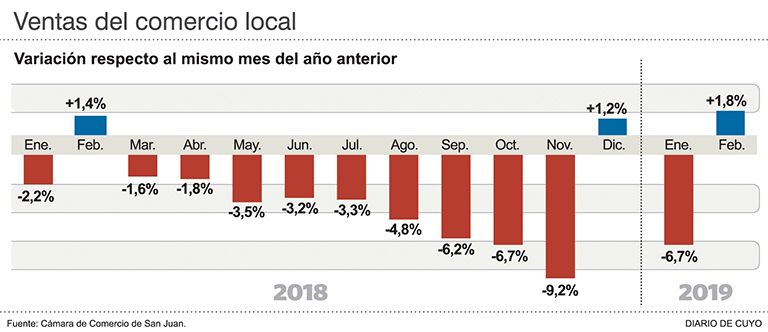 Este año las ventas del comercio sanjuanino arrancaron complicadas, con una caída del 6,7% en enero (ver infografía), y tuvieron un pequeño repunte en febrero, que acaba de finalizar. Fue por las ventas escolares, el outlet de los negocios y por los buenos números del sector gastronómico durante la celebración de la Fiesta Nacional del Sol, que concluyó el sábado pasado, según dio a conocer la Cámara de Comercio, que hace las mediciones mes a mes.