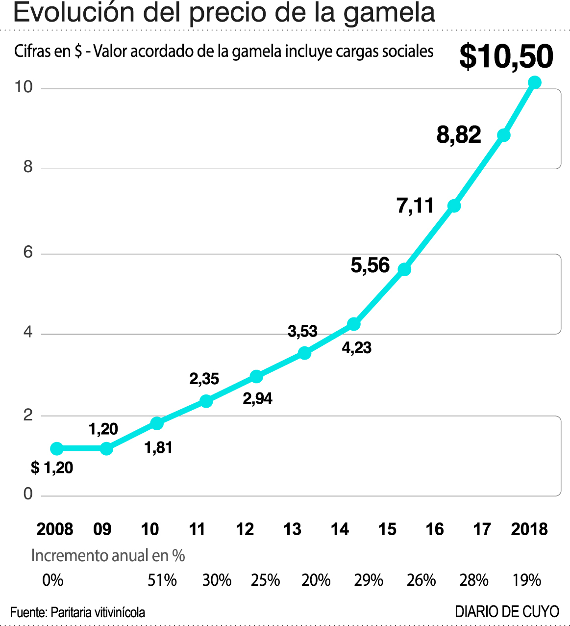 Como parte del acuerdo paritario estará incluido el valor de la gamela o tacho de uva, que para esta cosecha será de 10,50 pesos en bruto, mientras que el trabajador recibirá en mano 8,71 pesos. El valor representa una suba del 19% con respecto a la vendimia del año pasado, en la que el monto fue fijado en 8,82 pesos.