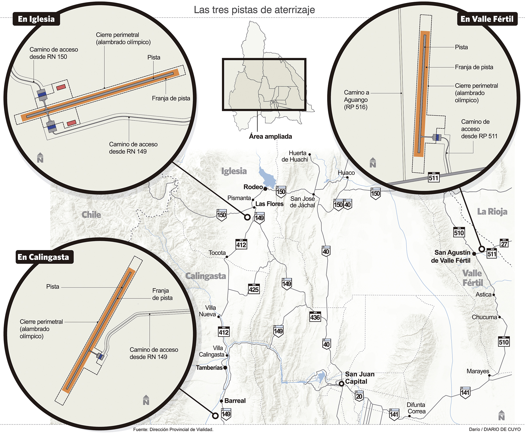En el caso de Iglesia la pista tendrá 2.180 metros de extensión, entre las localidades de Las Flores y de Bella Vista y tendrá accesos tanto desde la Ruta Nacional 149 como desde la 150, que va a Chile. Cuesta unos $922,4 millones.