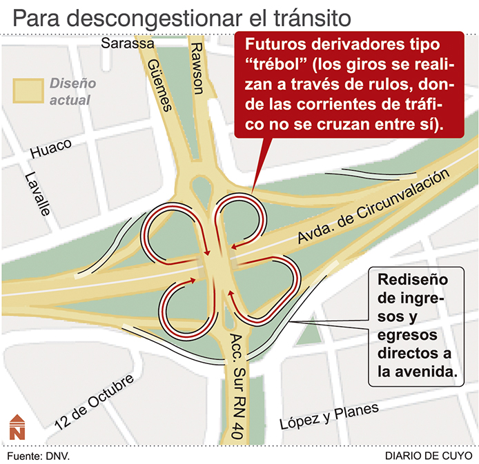 Para dar solución a la circulación vehicular en una zona peligrosa y de difícil tránsito, que es la comprendida en la conexión de la Avenida de Circunvalación con la Ruta 40 en el sector del Acceso Sur, en Vialidad Nacional están terminando de confeccionar un proyecto. Se trata de la construcción de una intersección tipo "trébol", según la denominación en el organismo, en la que todos los giros se harán a la izquierda, a través de "rulos", sin cruzar ninguna corriente de tráfico, y los giros a la derecha se harán mediante ramales directos. Las obras están calculadas en unos 1.000 millones de pesos, que saldrán del presupuesto nacional, y la idea es licitar y empezar los trabajos en los primeros meses del año próximo.