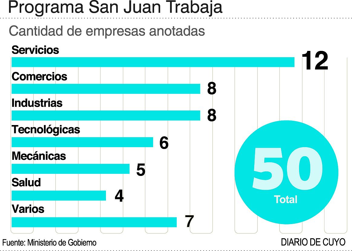 De las 50 empresas interesadas en tomar empleados en el marco del Programa San Juan Trabaja, las de servicios, que suman 12, son las que ocupan el primer lugar, seguidas por comercios e industrias. El dato surge de un relevamiento realizado por el Ministerio de Gobierno del plan que propone que el trabajador pueda recibir una ayuda del Estado provincial de $10.000 durante 3 meses, renovables por otro período igual. En la plataforma habilitada, ya se anotaron, además, 5.000 personas, de las cuales 3.000 buscan un empleo porque están desocupadas y las otras 2.000 tienen intenciones de capacitarse.