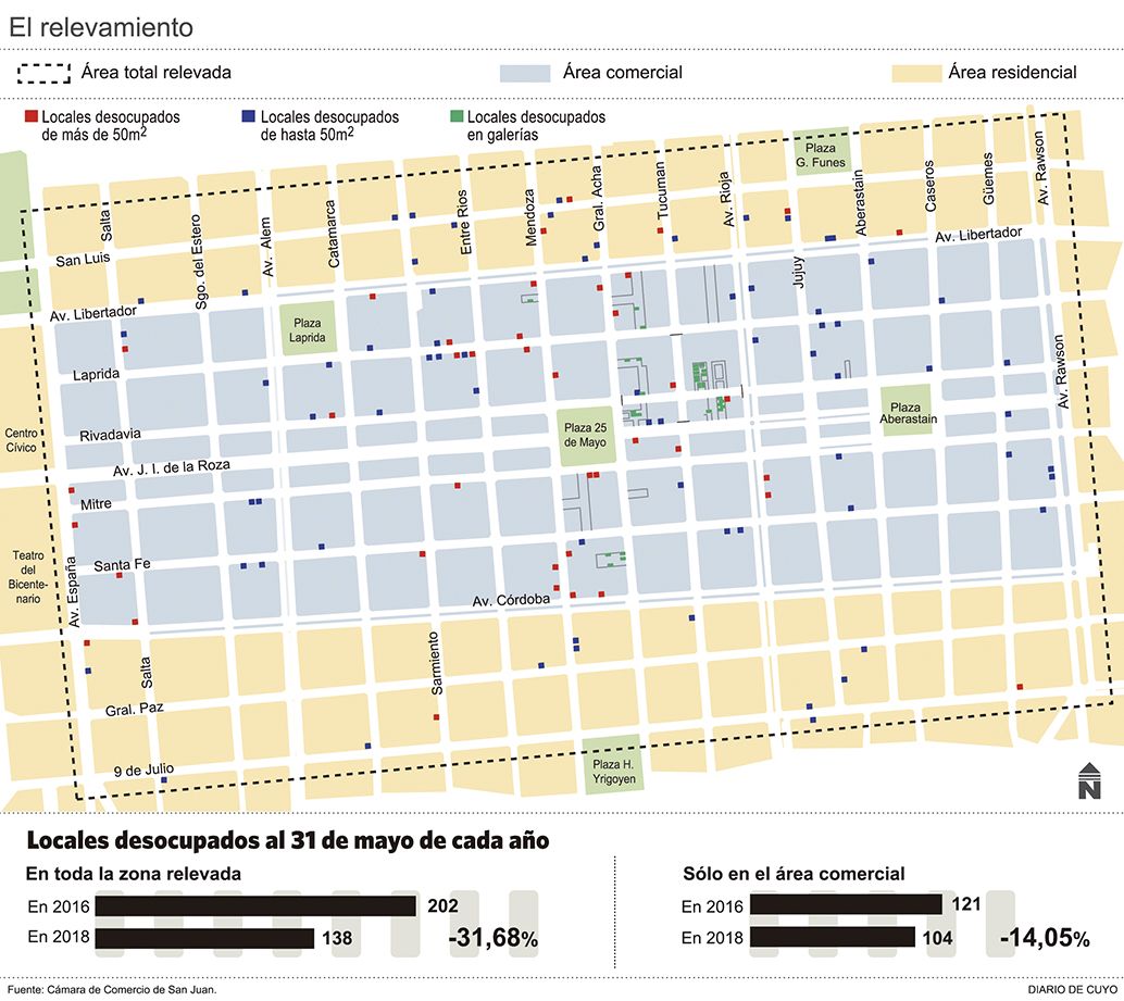 A pesar de las estadísticas que señalan que se registran tres meses consecutivos de caída de ventas del comercio sanjuanino, un informe elaborado por la Cámara de Comercio reveló que en los dos últimos años, desde mayo del 2016, se redujo la cantidad de locales desocupados en el centro de la ciudad. Así se pasó de 202 salones vacíos por aquel entonces a 138 en la actualidad, que marca un descenso del 31,68% (ver infografía).