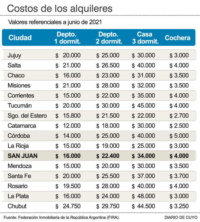 En junio pasado, según un relevamiento nacional de la Federación Inmobiliaria de la República Argentina (FIRA) (ver infografía), los valores de la provincia estaban más o menos a mitad de la tabla. En otras palabras, los valores que se pagan en San Juan no están entre los más caros, pero tampoco entre los más bajos. Por ejemplo, en Cuyo, los de la provincia están por arriba de los que se pagan en Mendoza.