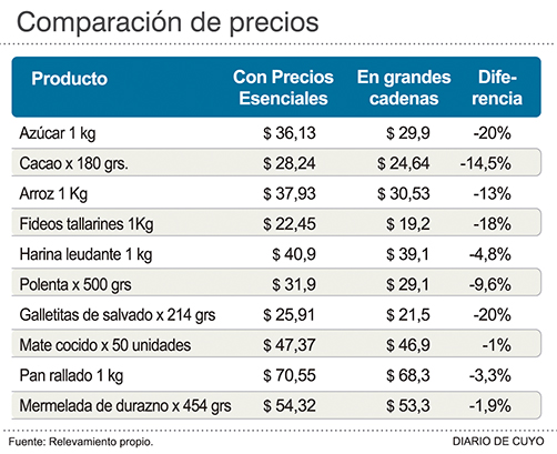 Frente a ese panorama, algunas marcas aprovecharon para negociar con la cadenas nacionales con locales en San Juan algunos productos a un precio que, en la práctica, se encuentra hasta un 20% por debajo que el listado oficial. Es el caso del azúcar, que en el listado de Precios Esenciales figura a 36,13 pesos el kilo, pero que en algunas sucursales en la provincia se podía encontrar a 29,90 pesos, es decir hasta un 20% menos (ver infografía). Las galletitas de salvado también estaban hasta un 20% más baratas y había otros casos con precios más económicos como los de los fideos tallarines (-18%), el cacao (-14,5%) o el arroz (-13%)