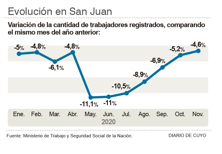 Entre los rubros que hicieron repuntar el trabajo se encuentran principalmente los servicios de Hotelería y restaurantes, y la Construcción, entre otros. El informe muestra datos de noviembre de 2020, cuando la cantidad de personas con trabajo en blanco en San Juan alcanzó a 72.500, un 0,3% más (217 trabajadores) respecto a los puestos existentes en octubre. El análisis se hace mensual, porque se está monitoreando la evolución en la pandemia. Si bien la recuperación es lenta, después de las caídas drásticas durante los peores meses del aislamiento obligatorio, la variación positiva se ve por tercer mes consecutivo, y ha sido impulsada por sectores como el turismo -con servicios de hotelería y restaurantes- que muestra el mayor incremento con un 2,8% en noviembre respecto a octubre; y construcción, con una suba del 1,9% intermensual.