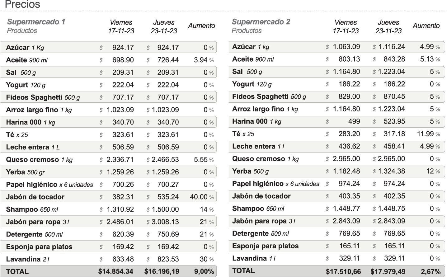 Si bien el Indec registró que el mes pasado hubo una desaceleración de la inflación al marcar un 8,3 por ciento y el valor del dólar blue no ha tenido una gran escalada luego de los comicios (pasó de 1.050 a 1.100 para la venta en la provincia), los grandes proveedores enviaron el lunes por la noche nuevas listas de precios en algunos supermercados, dijeron a este medio fuentes del sector. En el relevamiento, hubo precios que se mantuvieron y las fuentes explicaron que, en esos casos, prefirieron absorber los aumentos antes que trasladarlos al consumidor. En cambio, hubo otros artículos que sí aumentaron. ¿Una forma de compensar?