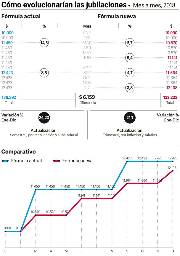 Supongamos un jubilado que gana $10.000 por mes desde enero próximo, una cifra no muy lejana al haber promedio hoy. Con la fórmula actual (línea azul en la infografía), que marca una actualización semestral al ritmo de la marcha de la recaudación de la Anses y de los salarios, esa persona obtendría $ 138.392 en todo 2018.