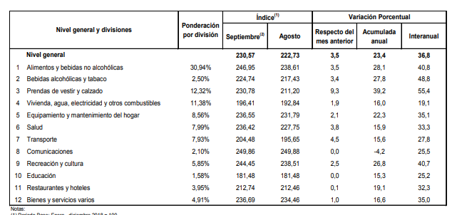 A la vez, señala que "se observa que los mayores aumentos se dieron en las divisiones Prendas de vestir y calzados (9,3%) y Transporte (4,5%), mientras que Bienes y servicios diversos (1,0%) y Restaurantes y hoteles (0,1%) registraron las menores subas. Las divisiones Comunicaciones y Educación no presentan variación respecto del mes anterior".