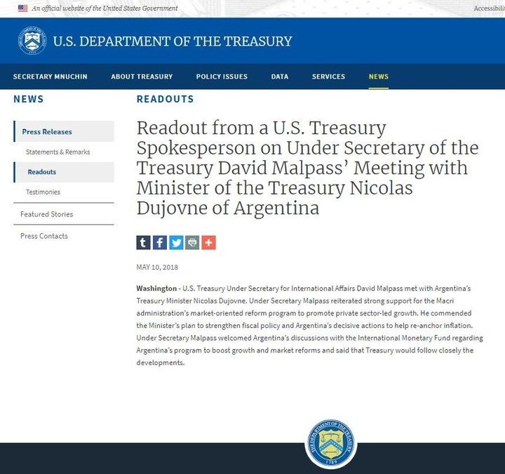En un comunicado difundido por el Departamento del Tesoro tras una reunión esta mañana entre el ministro de Hacienda Nicolás Dujovne y el subsecretario para Asuntos Internacionales del Tesoro, David Malpass, el ministerio estadounidense reiteró “el fuerte respaldo a las reformas orientadas al mercado del presidente Macri para promover el crecimiento liderado por el sector privado”. Agregó que Malpass elogió el plan de Dujovne para “ajustar la política fiscal y la acción decisiva de Argentina para contener la inflación”.