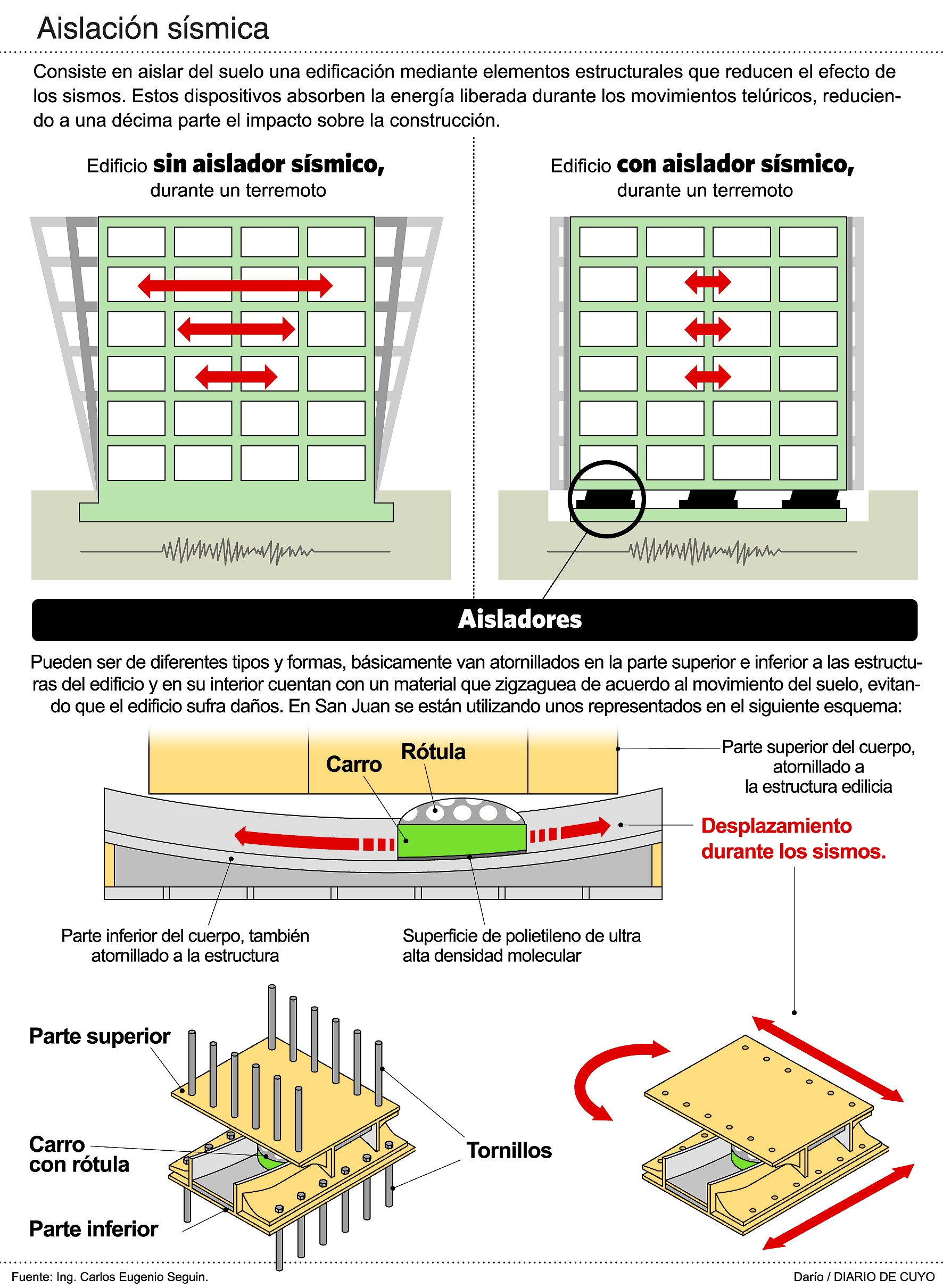 Si hay un evento de la naturaleza que irradia temor en San Juan por la destrucción que produce es el terremoto. Por eso muchos miran con atención lo que acaba de ocurrir en México y varios son los que aquí se sentirán atraídos por una novedad constructiva que comenzó a probarse hace poco en la provincia y que el propio Instituto Nacional de Prevención Sísmica (Inpres) anunció que comenzará a propagar porque salvaguarda las estructuras y todo lo que hay adentro. Ese es el caso del sistema constructivo "aislamiento basal sísmico", un método que a través de dispositivos que se colocan en los cimientos (ver infografía), muy diferente a los rodillos, está comprobado que absorben el 90% del impacto del sismo y que permiten que a la estructura del inmueble llegue sólo la décima parte de lo que llegaría en una construcción sismorresistente convencional. De esa forma se logra no sólo que no colapse la estructura sino que no se mueva tanto el inmueble, evitando que se caiga o vuele todo lo que está dentro, ya sean personas u objetos. Así lo explicó Carlos Eugenio Seguin, un sanjuanino que en 1996 emigró a Chile a hacer un doctorado y que luego creó una empresa que fabrica estos dispositivos. El ingeniero civil que se recibió en la Universidad Nacional de San Juan, será el principal orador mañana en una conferencia que organizó la Cámara de la Construcción e Inmobiliaria para presentar este sistema (ver página 3).
