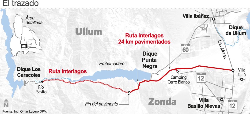 En medio de un paisaje impactante y con el espejo de agua del dique Punta Negra de fondo, el Gobierno provincial dejó inaugurada ayer la Ruta Interlagos, que parte desde calle Las Moras, en Zonda, y conecta con el dique Los Caracoles. La novedad es que hay intención de que la obra, que va camino a convertirse en uno de los principales atractivos turísticos de estas vacaciones de invierno, sea iluminada en una primera etapa con paneles solares hasta que se haga el tendido eléctrico definitivo, según dijo el ministro de Infraestructura, Julio Ortiz Andino. Aún no definen fechas. El camino es parte de la Ruta Provincial Nº 12, que el futuro, y luego de que esté construido el dique Tambolar, será vía de conexión con Calingasta.