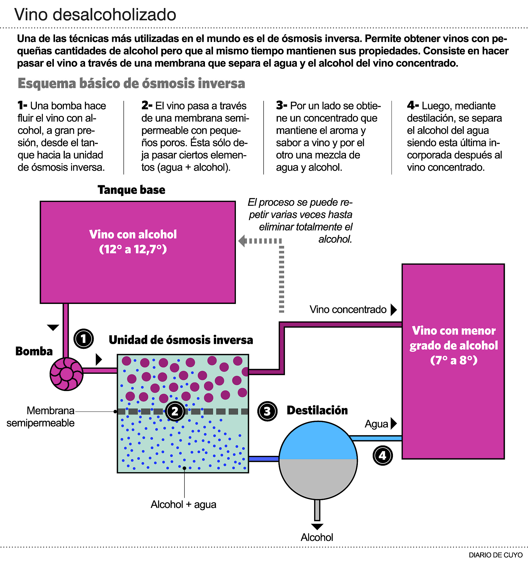 A juzgar por el entusiasmo de bodegueros consultados, y por los aportes no reintegrables que pone el gobierno como incentivo; la provincia de San Juan se apresta a ser un flamante jugador argentino en el sector de los vinos de baja graduación alcohólica. Esa es una tendencia que está despuntando con fuerza en el Reino Unido y España, entre otros países productores del Viejo Mundo, donde los consumidores se inclinan por opciones más saludables. San Juan es la primera del país en dar un paso para bajar el alcohol a sus vinos en el 2018, con el objetivo de diversificar, y sobre todo apuntando a aumentar el consumo, que viene cayendo en forma sostenida. El miércoles pasado se lanzó la convocatoria (ver página 3) que cierra el 1 de enero, para convocar a bodegas interesadas en incorporar máquinas especiales que regalará el gobierno para lograr vinos con menos alcohol. El Ministerio de Producción destinó alrededor de $3,5 millones para comprar entre 3 y 4 equipos para las bodegas que resulten seleccionadas por un jurado integrado por autoridades provinciales y nacionales, y que permitirán reducir la graduación alcohólica a un nivel de 7 u 8 grados, como tiene su competidora, la cerveza. En el gobierno aclaran que el requisito clave es no resignar la calidad y las condiciones organolépticas de los vinos. Teniendo en cuenta que este año el grado que fijo el INV para San Juan es de 12º para los tintos y de 12,7º para blancos, con el nuevo equipamiento en el 2018 se obtendrán vinos de color que contendrán un 58 a 67% menos de alcohol, y del mismo modo, blancos reducidos entre 55 a 63%.