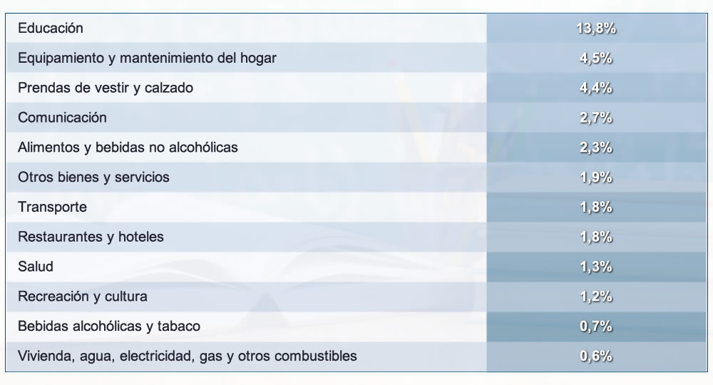Les siguieron en la lista Comunicación que avanzó un 2,7% y Alimentos y bebidas no alcohólicas, que ascendió un 2,3%.
