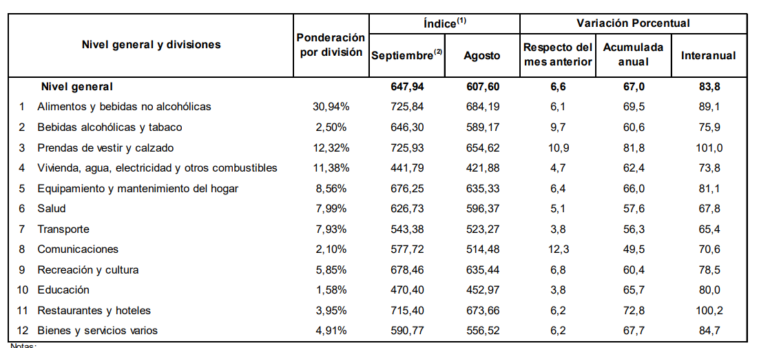Al mismo tiempo, indica que, en los primeros 9 meses del año, la suba general alcanza el 67 por ciento. "La trayectoria interanual de este indicador se ubicó en 83,8 por ciento (6,0 puntos porcentuales por encima del mes anterior)", sostiene el documento.
