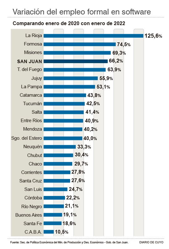 Daniel Gimeno, secretario de Política Económica, destacó que en el ultimo año se han capacitado más de 2.000 sanjuaninos, y que esperan una cifra similar en esta edición de capacitaciones que va a comenzar a mediados de setiembre. ‘Son cursos muy importantes porque son generadores de mano de obra. Lo positivo es que con una capacitación no tan larga como es una formación de grado en la universidad, de solo entre tres y nueve meses de capacitación, se puede lograr un empleo de calidad que puede ir mejorando en el tiempo en la medida que la persona se vaya insertando en el mercado laboral de la economía del conocimiento’, explicó el funcionario. Gimeno destacó que la denominada ‘economía del conocimiento’ es un sector que el gobierno de San Juan está apoyando fuertemente dentro del Ministerio de Producción, por la finalidad que tiene para generar mano de obra de calidad. San Juan es la cuarta provincia del país en donde más se generó trabajo tecnológico en los últimos dos años (ver infografía).