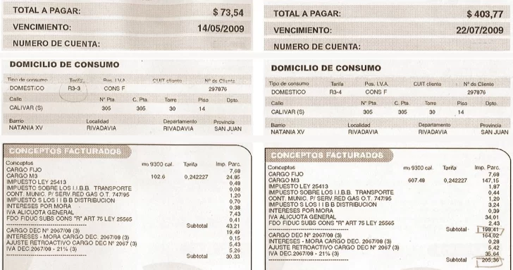 Hay casos denunciados de clientes que tuvieron recategorizaciones por mayor consumo y pasaron de R1 en septiembre de 2008 a R3-4 en la factura de julio de 2009 (ver arriba). En este caso concreto la titular pasó de pagar $73 en mayo de 2009 a pagar $403 en julio de 2009.
