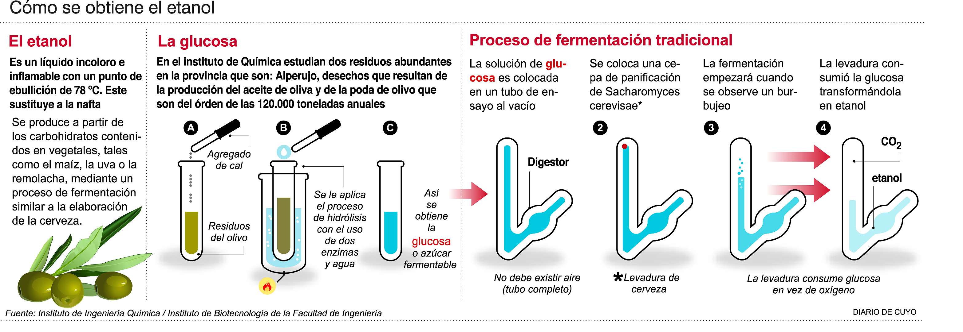 Un grupo de investigadoras del Instituto de Ingeniería Química y el Instituto de Biotecnología de la Facultad de Ingeniería están desarrollado un nuevo proceso para obtener biocombustibles a partir de los residuos de la actividad olivícola. El método emplea cal para obtener azúcar a partir de la celulosa que contienen en forma cubierta los alperujos (desechos de la elaboración de aceite) y los restos de poda de olivos, para posteriormente transformarla en bioetanol (ver infografía). Si bien la investigación está en la fase experimental, lo interesante es que promete un gasto no muy caro en el desarrollo económico a escala industrial porque para su elaboración usa además materia prima existente en la provincia como es la cal. Además, el biocombustible obtenido de la basura tiene las mismas características que los de producción de caña de azúcar, uno de los cultivos más importantes para su elaboración. Esta técnica fue desarrollada por Cristina Deiana, directora de la Maestría de Tecnologías Ambientales y las investigadoras Laura Herrero, Arminda Mamaní y Laura Montoro, y será presentado junto a otras investigaciones en el II Simposio de Residuos Agropecuarios y Agroindustriales del NOA y Cuyo.