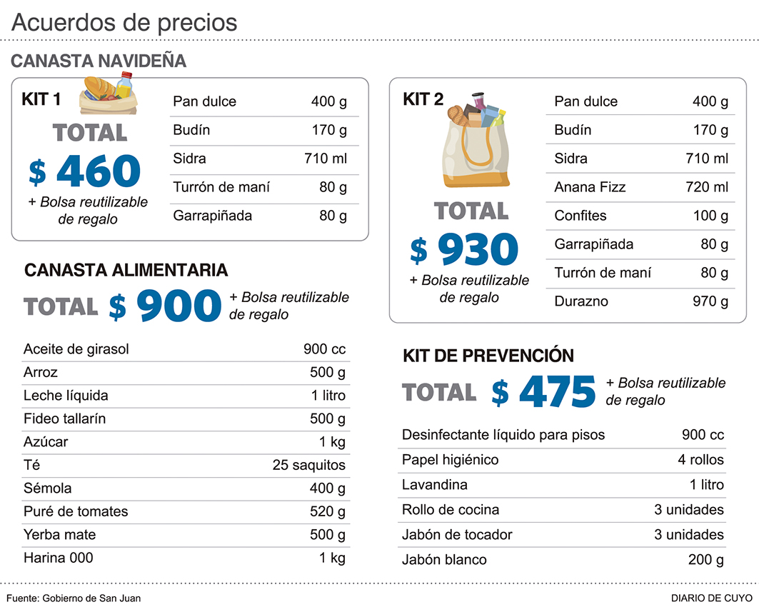 El Gobierno alcanzó un acuerdo con representantes de supermercados locales y desde el próximo lunes y hasta fin de mes, vuelven los dos kits navideños a las góndolas de 20 locales de toda la provincia: se trata de un combo básico de 5 productos típicos para celebrar las fiestas que incluyen un pan dulce, sidra, budín, turrón de maní y garrapiñadas a 460 pesos, y otro más grande de 10 productos a 930 pesos. Este último contiene pan dulce, budín, sidra, ananá fizz, confites, garrapiñadas, turrón de maní y una lata de duraznos, según datos proporcionados por la Secretaría de Industria, del Ministerio de Producción y Desarrollo Económico. Si bien ambos combos se encarecieron en un año más que la inflación, son los más económicos que se pueden encontrar en el mercado. El año pasado los kits oficiales con los mismos productos costaron 240 y 599 pesos en los supermercados sanjuaninos. Eso indica que para este año las promociones se incrementaron entre un 92% y un 55%. Y el último dato de inflación relevada por el INDEC es del 52% y todas las consultoras privadas indican que este mes se ubicará 3 puntos arriba. Pero en los supermercados de cadenas nacionales los precios son más altos, y parten desde los 700 pesos las cajas con productos navideños más baratas y llegan hasta 2.000 pesos. En el Gobierno, dicen que pese a los esfuerzos por contener la suba, en la mesa de negociación no pudieron lograr precios menores. "Analizamos cuatro presupuestos con los supermercadistas, y elegimos el más económico para ofrecer al público" dijo la secretaria de Industria, Adriana Vargas. Agregó que los supermercados locales tampoco son formadores de precios, y se mostró satisfecha porque consideró que "en resumen, las canastas están baratas y con precios razonables". También agradeció el esfuerzo que han hecho los supermercadistas para poder cumplir con estos precios y garantizar el stock en toda la provincia y los locales adheridos. No respondió las llamadas el representante de la Cámara de Supermercados sanjuaninos, Mario Gee. Por último, Vargas informó que ambos kits estarán vigentes en San Juan desde el 6 y hasta el 31 de diciembre. Junto con ellos y dentro del programa "Elegí bien, Comprá mejor" también se extienden durante el mes de diciembre los kits de alimentos y de prevención, a precios accesibles (ver aparte).