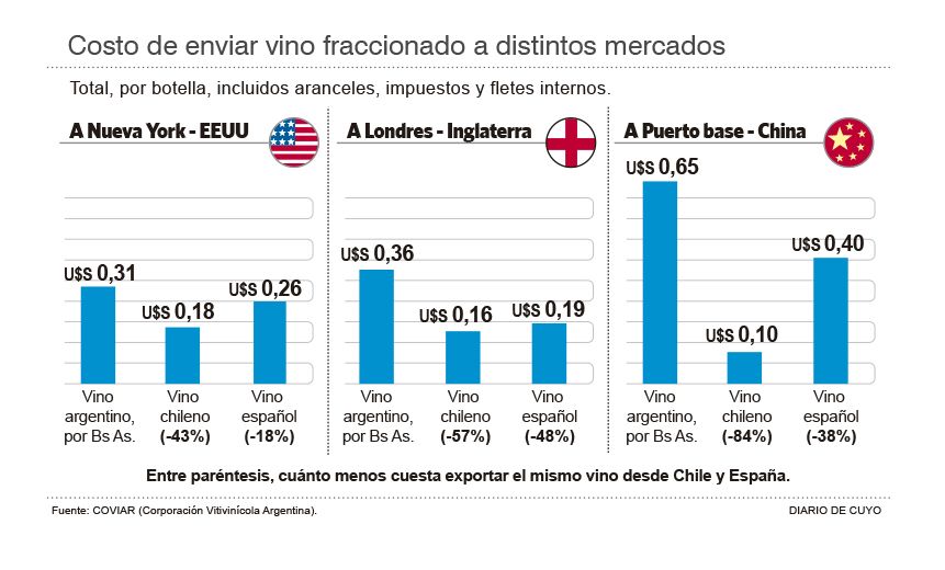 Por fletes y carga impositiva y arancelaria, los exportadores de vinos argentinos son los grandes perdedores frente a sus competidores en los principales mercados de consumo mundial, según indica un estudio elaborado por la Corporación Vitivinícola Argentina (Coviar) que fue presentado el viernes pasado en San Juan. Por cada botella de vino argentino que un exportador coloque en Nueva York, por ejemplo debe pagar 31 centavos de dólar por esos costos, mientras que una botella chilena o española llega a ese mercado con un 43% y un 18% menos respectivamente (ver infografía).