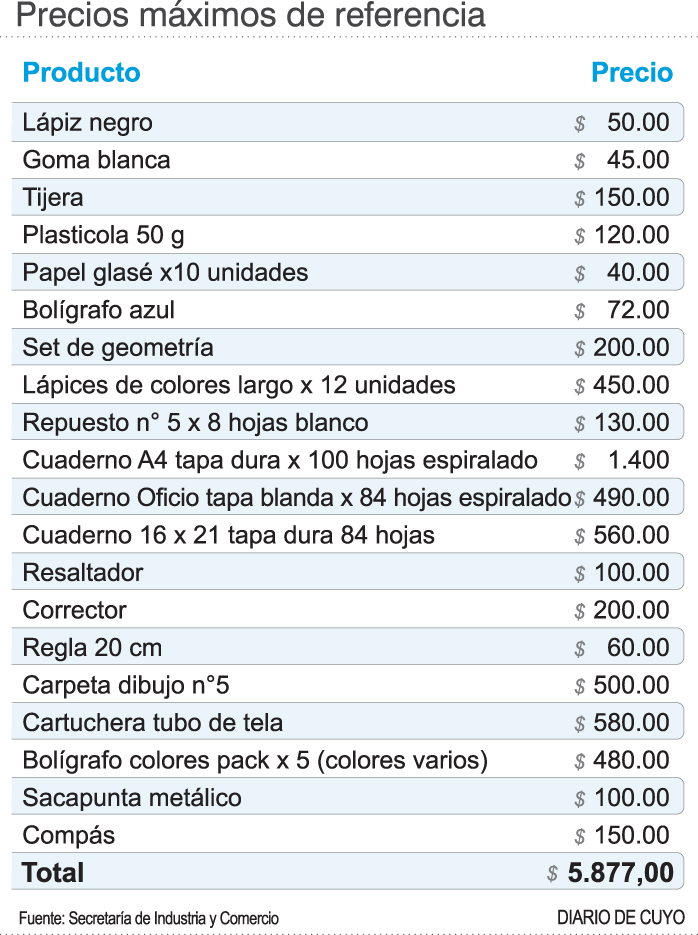 La canasta escolar que todos los años el Gobierno sanjuanino acuerda con las librerías locales para el inicio de las clases viene en el 2023 un 35% más baja que los artículos incluidos en el plan Precios Justos del Gobierno nacional. Es porque el total de los 20 artículos incluidos en el combo local suman $5.877, mientras que la misma cantidad de productos en el programa nacional llegan a los $7.930. Las ofertas estarán disponibles a partir de hoy en un total de 17 librerías del Gran San Juan, identificadas con el logo del Programa "Precios máximos de referencia", según dio a conocer la secretaria de Industria y Comercio, Adriana Vargas.